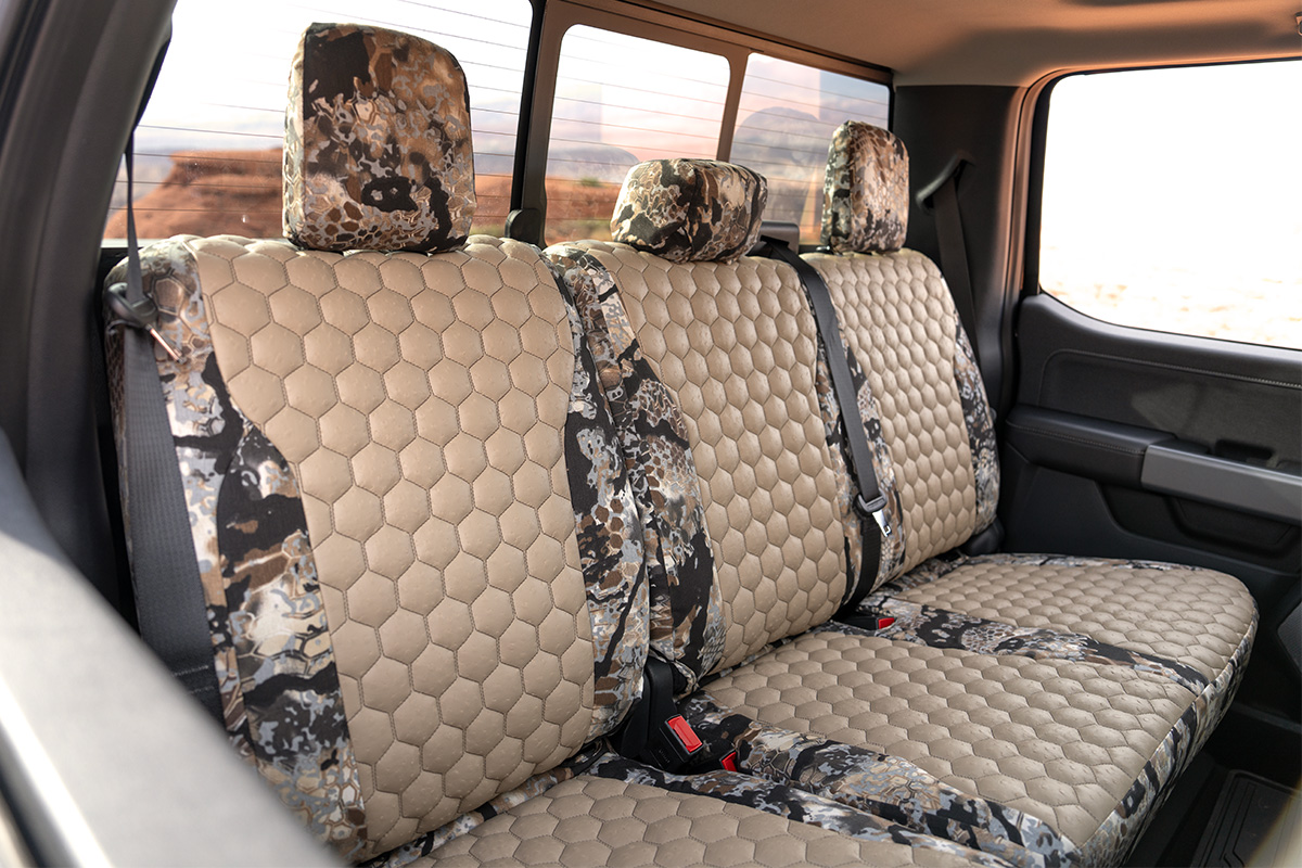 A quilted insert can be paired with a trim in a fabric not listed here, such as Camo, for a fully customized look.